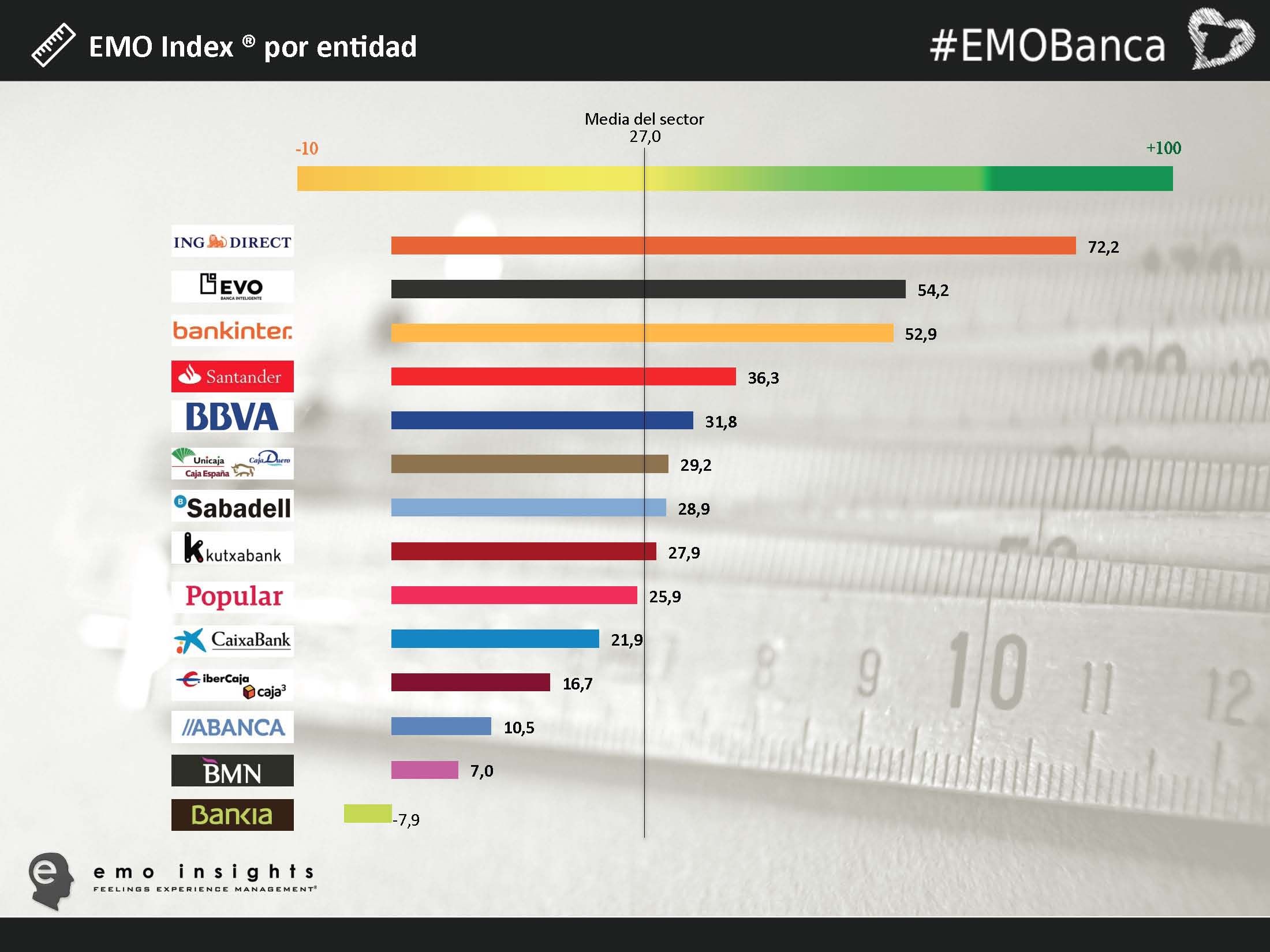 Álvaro Marín, Responsable de Metodologías y Tecnología de Medición de Emociones de EMO Insights, aseguró que «este año aumenta el EMO Index del sector bancario. Los bancos ha mejorado emocionalmente con respecto al año anterior, aunque hay mucha variabilidad entre las distintas entidades. Curiosamente las reclamaciones bien gestionadas son uno de los «touchpoints» fundamentales para generar emociones positivas.»