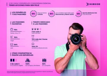 Las aficiones son imprescindibles para los españoles y un 99% asegura tener al menos una pasión, que considera esencial para ser feliz (67%) y desconectar de la rutina diaria y liberar estrés (80%), según revela el Estudio de las pasiones llevado a cabo por Hubside en colaboración con IPSOS. Sin embargo, sólo el 2% de los españoles se dedica de forma profesional a su pasión y el 42% no quiere hacer de su hobby su trabajo, porque se convertiría en rutina y dejaría de ser divertido.