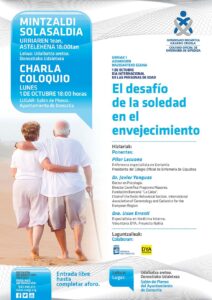 El Colegio Oficial de Enfermería de Gipuzkoa ha organizado una charla abierta a la ciudadanía bajo el título “El reto de la soledad en el envejecimiento”, que tendrá lugar el próximo lunes, 1 de octubre, a las 18,00 horas, en el Salón de Plenos del Ayuntamiento de Donostia-San Sebastián con entrada libre hasta completar aforo. Intervendrán Javier Yanguas, Doctor en Psicología y Director Científico del Programa Mayores de Obra Social La Caixa; la Dra. Uxue Errasti, especialista en medicina interna y voluntaria de DYA (Proyecto Nahia); y Pilar Lecuona, presidenta del COEGI y enfermera especialista en Geriatría.