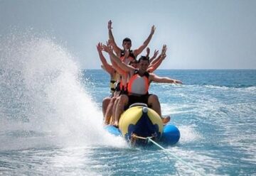 La banana acuática: Seguramente la atracción más famosa de todas pero no por eso deja de ser una atracción muy solicitada y divertida. Se trata de viajar encima de una banana a toda velocidad por el mar, el último que aguante y no se caiga es el ganador. Una actividad genial para despedida de soltero en Málaga.