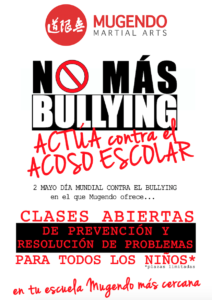 En vista de esto, el grupo de escuelas marciales refuerza su lucha contra esta problemática y organiza el próximo día 2 de mayo talleres de prevención y concienciación sobre el acoso escolar y el Bullying para niños y padres dentro de Barcelona, País Vasco, Comunidad Valenciana e Islas Canarias. Según uno de los directores de Mugendo Martial Arts, Samuel Bergillos (Cinturón Negro 6o Dan), “El objetivo es que todos los niños tengan claro qué es el acoso escolar y cómo reaccionar cuando se vean acorralados en situaciones de conflicto, violencia física o ciberacoso -por ejemplo- usando técnicas de defensa personal o teniendo conocimiento y fácil acceso a los colectivos que les pueden ayudar a gestionar estos casos para que no les afecte en su rutina familiar ni a su rendimiento escolar”. Por el momento, se espera una asistencia de unas 1.000 familias alrededor de todo el territorio nacional.