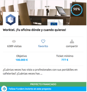 Worktel, la primera plataforma que permite reservar desde cualquier dispositivo espacios de trabajo y salas de reuniones por horas, con disponibilidad y reserva en tiempo real, buscaba a través de Fellow Funders recaudar 100.000 euros con un ticket mínimo de 777 euros. Finalmente, la startup ha conseguido captar 98.060 euros a partir de 57 inversores diferentes.