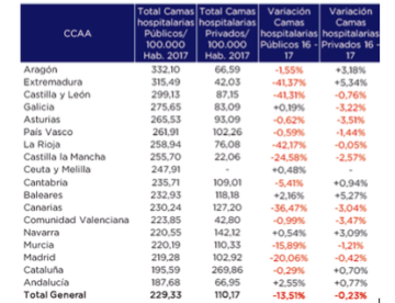 Por otra parte, en el Observatorio han contabilizado también los hospitales y camassanitarias públicos y privados. De los 788 hospitales existentes en España, 451 son privados (57%) y de las 157.665 camas, el 32, 5% son privadas. A tenor de estos datos se comprueba que más de la mitad de los hospitales son privados, mientras que sólo una cama de cada tres es privada.