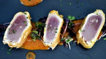 Bonito del Norte albardado con salsa romescu 12,00 € (media ración) /22,00 €