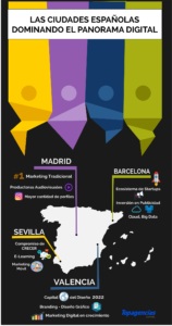 Según la investigación de Topagencias, las ciudades con mayor oferta (y demanda) de servicios de Marketing son Madrid, Barcelona, Valencia y Sevilla, en este orden.