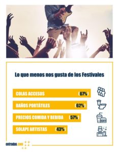 En nuestro país, los festivales tienen muchos adeptos pero ellos mismos reconocen que hay muchos aspectos que podrían mejorar la experiencia. Lo que más detestan los españoles a la hora de acudir a un festival son las grandes colas que se forman en los accesos, los baños, los altos precios de la comida y la bebida y cuando los artistas se solapan. Para muchos, los disgustos aumentan cuando se incluye en la ecuación una zona de camping, ya que al 21% de los encuestados no le gusta dormir en tiendas de campaña. De hecho, cada vez más personas optan por dormir en un hotel (21%) o ni siquiera pasan la noche en el festival, comprando entradas de día (32%). En el lado opuesto, lo más valorado por los encuestados a la hora de acudir a un festival es, en primer lugar, el poder disfrutar de varios artistas juntos en un solo evento (72% de los encuestados), seguido de la buena organización de horarios y accesos y el buen ambiente que suele haber entre los asistentes, que suelen ser muy afines entre sí en gustos musicales. Respecto a los imprescindibles a la hora de llevar a un festival, los encuestados lo tienen claro: calzado cómodo (94%) y complementos que ayuden a sobrellevar el calor: gafas de sol (63%), protección solar (36%) y, los siempre útiles, gorras y abanicos (33%).