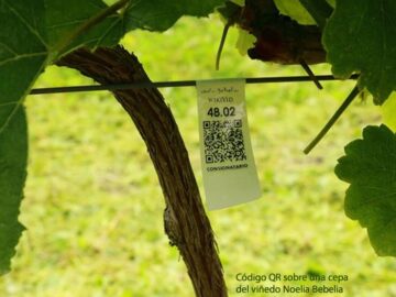 Son las 10 de la mañana de un día de julio en el viñedo de Noelia Bebelia. Noelia y Simón recorren las filas de su viñedo; de vez en cuando acercan su teléfono a una cepa para escanear su código.