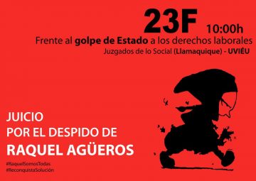 El 23F a las 10 de la mañana, nos concentramos delante del juzgado de lo social, Llamaquique, Oviedo, en solidaridad con Raquel Agüeros, presidenta del Comité de Empresa del Hotel de la Reconquista, la cual lleva despedida desde el 7 de diciembre, estando de baja en el momento del despido (baja que a día de hoy continúa). Será el juicio sobre el despido. El juicio comenzará a las 10:30 en dicho juzgado.