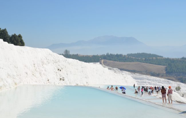 Castillo de algodón en Turco, es una zona natural famosa por sus piscinas colgantes con aguas termales ricas en minerales, donde te puedes dar un baño a 37 grados y después visitar las ruinas de Hierápolis, antigua ciudad helenística, hoy en ruinas y declarada Patrimonio de la Humanidad por la UNESCO.