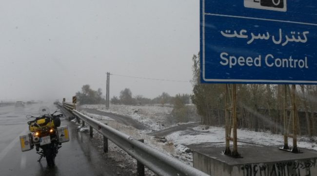 En Irán, país en el que circulan muchos coches, de repente empecé a darme cuenta de que había muy pocos y más adelante los puestos de venta que había a ambos lados de la carretera eran arrancados de cuajo por un fuerte viento que terminó con mi moto en el suelo. Hice noche en Tabriz en medio de una intensa nevada, y cuando entré en el pueblo fronterizo de Dogubeyazit, pasó de nieve a hielo, era una auténtica pista de patinaje, me caí hasta tres veces seguidas ante las burlas de muchos vecinos y los coches que me pitaban detrás, la frustración, rabia y cansancio eran visibles y en un momento dado me dí al vuelta y les grite “no por mucho pitar voy a levantar la moto del suelo”.
