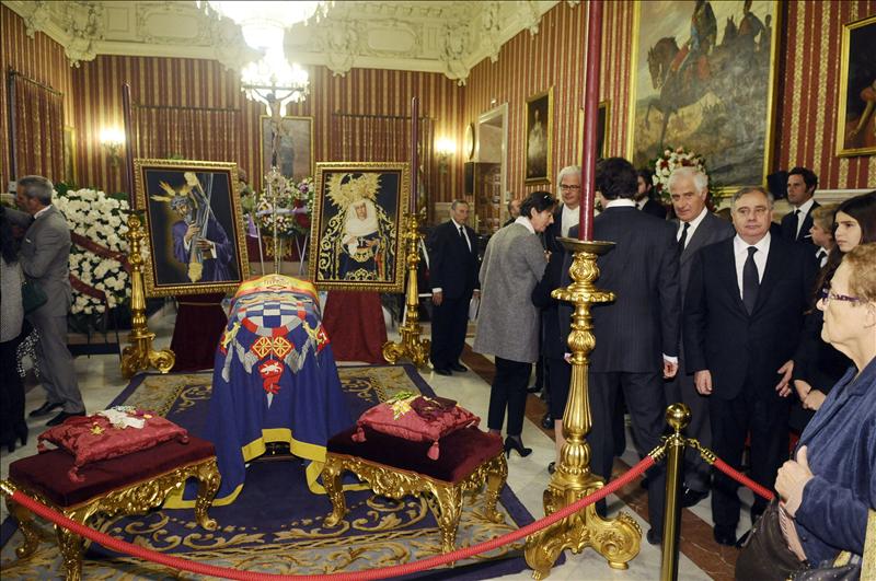 La capilla ha quedado abierta al público a las 14.10 horas, después de que el féretro haya sido colocado en el centro del Salón Colón, cubierto con la bandera de España y el escudo de la Casa de Alba, en una estancia en la que se han colocado cuatro grandes velones y dos cuadros del Cristo de los Gitanos y la Virgen de las Angustias, de los que era muy devota.