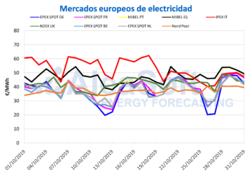 Desde el viernes 25 de octubre los precios promedios diarios del mercado MIBEL para ambos países se han posicionado como los de mayor precio de Europa, siendo superiores a los del mercado IPEX de Italia entre 1,89 €/MWh y 5,57 €/MWh. Este aumento en los precios se ha visto condicionado por la baja producción de eólica y solar de estos últimos días.