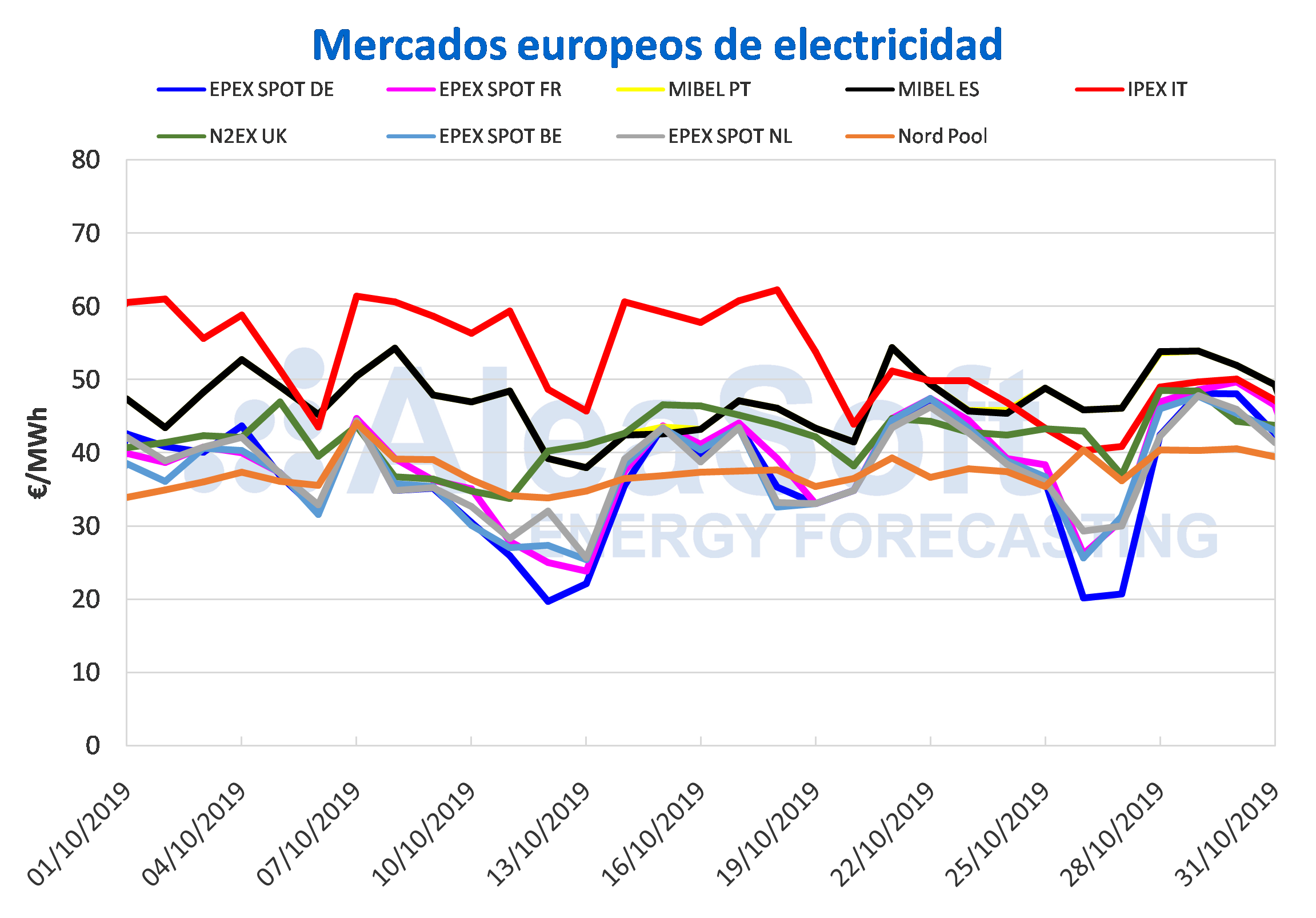Durante este mes de octubre el mercado EPEX SPOT de Alemania ha sido el de precio más bajo de Europa, con un promedio mensual de 36,96 €/MWh, mientras que el mercado IPEX de Italia continuó siendo el mercado con el precio más alto, con un precio promedio mensual de 52,84 €/MWh.