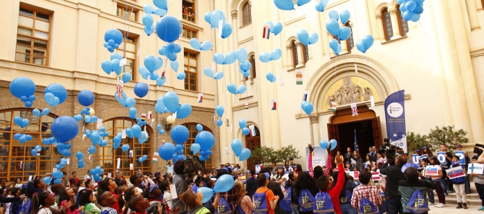 Cerca de doscientos alumnos del CEIP Juan XXIII de Zaragoza han protagonizado la celebración del Día de Europa en la sede principal del Gobierno de Aragón. Desde el patio de la Sala de la Corona del edificio Pignatelli, han soltado decenas de globos que contenían sus testimonios y deseos sobre la Unión Europa ante el Presidente de Aragón, Javier Lambán, y la consejera de Educación, Cultura y Deporte, Mayte Pérez.