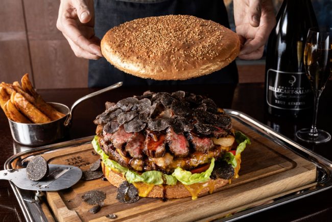La «Golden Giant Burger» lleva un kilo de carne de ternera, láminas de la exclusiva carne de res nipona Wagyu, foie gras, trufas negras frescas, queso cheddar, tomates cherry y rebanadas de dos tipos de cebolla entre dos panes espolvoreados con hojuelas de oro.
