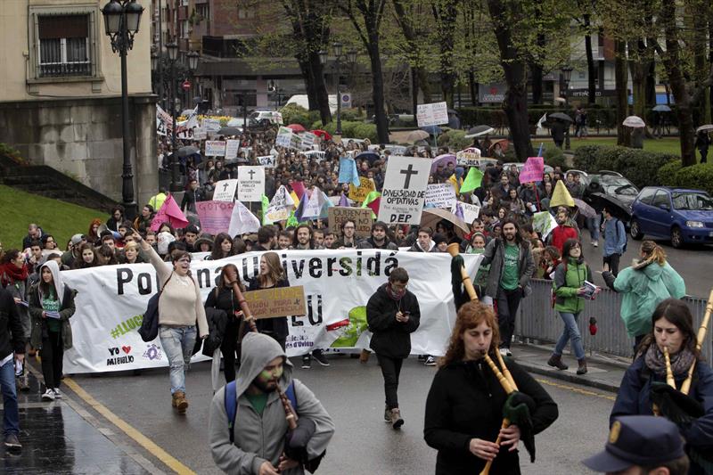 Oviedo, 3 abr (EFE).- Cientos de estudiantes de la Universidad de Oviedo se han manifestado hoy por las calles de la capital del Principado para criticar la «privatización» que, a su juicio, están realizando las administraciones públicas con el sistema educativo superior.