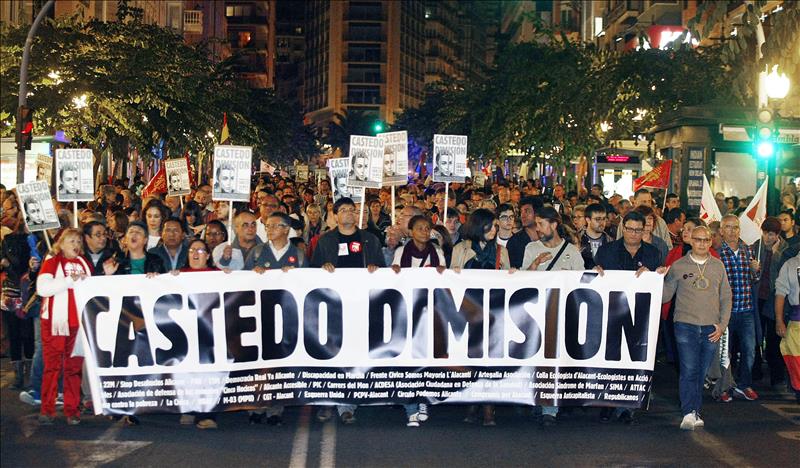 Alicante, 22 nov (EFE).- Una manifestación respaldada por cerca de 50 colectivos y partidos políticos ha recorrido esta tarde las calles de Alicante para volver a pedir la dimisión de la alcaldesa, Sonia Castedo, doblemente imputada por presuntos casos de corrupción en el Plan General de Ordenación Urbana (PGOU) y Rabasa.