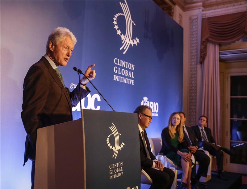 Clinton acudió al encuentro acompañado por su hija Chelsea, vicepresidente de la Fundación Clinton y quien por la mañana visitó la favela de Vidigal, en la zona sur de Río de Janeiro, para participar en la inauguración de una guardería financiada por esa organización.
