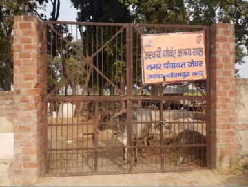 En las tierras del templo de Jewar se ha establecido un refugio temporal para las vacas, pero los locales dicen que muchas han muerto de enfermedad o de hambre por falta de fondos para el forraje.