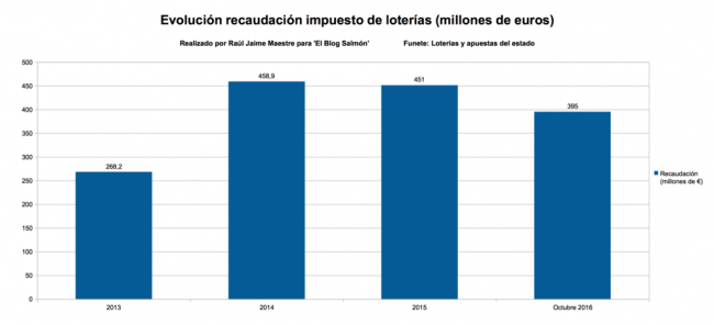 En el primer ejercicio de aplicación, el impuesto permitió al Estado recaudar algo más de 268 millones de euros. Un año después, en 2014, los ingresos aumentaron hasta alrededor de los 458 millones de euros. En el año 2015 los ingresos se mantuvieron en los mismo niveles alcanzado los 451 millones y durante el año 2016 la recaudación cae un 3,8 por ciento hasta octubre como se puede ver en la gráfica «Evolución recaudación impuesto de loterías»: