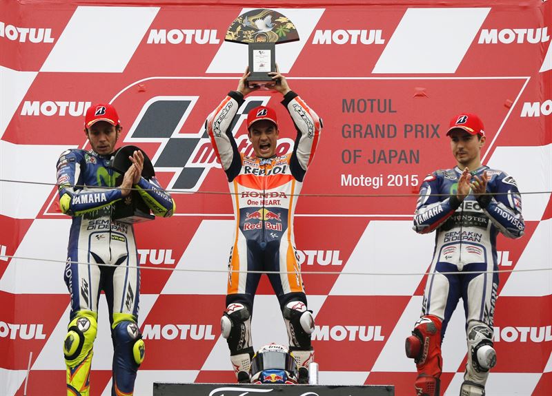 En Motegi, Rossi volvió a ganarle la partida al mallorquín, ‘poleman’ del sábado, en una carrera en mojado. De hecho, en la salida, se ponía por delante seguido de Lorenzo, Pedrosa, los italianos Andrea Iannone (Ducati) y Andrea Dovizioso (Ducati) y Marc Márquez (Repsol Honda). Sin embargo, poco le duraba la alegría al líder, que en la primera vuelta veía cómo Lorenzo recuperaba la posición y le metía siete décimas en el primer paso por meta.
