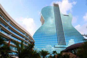 Los aficionados a la música ahora pueden pasar la noche en un hotel en Florida que tiene una gran particularidad: el Seminole Hard Rock Hotel & Casino, de 140 metros de alto, está construido efectivamente en forma de guitarra. ¿Dónde? En Hollywood, entre Fort Lauderdale y Miami. Las oficinas de Turismo locales indican que además tiene otro atractivo: por la noche seis hileras de luz iluminan desde el hotel el cielo, como si fuesen las cuerdas de la guitarra.