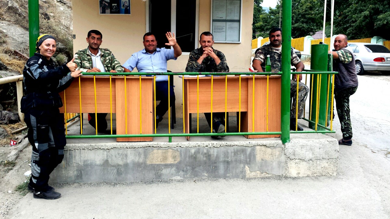 Llegamos a la frontera de Azerbaiyán, donde por mi condición de mujer me gritan y tiran con desprecio mi pasaporte de mala manera, detecto que eso de que una mujer llegue en moto no les ha gustado nada.