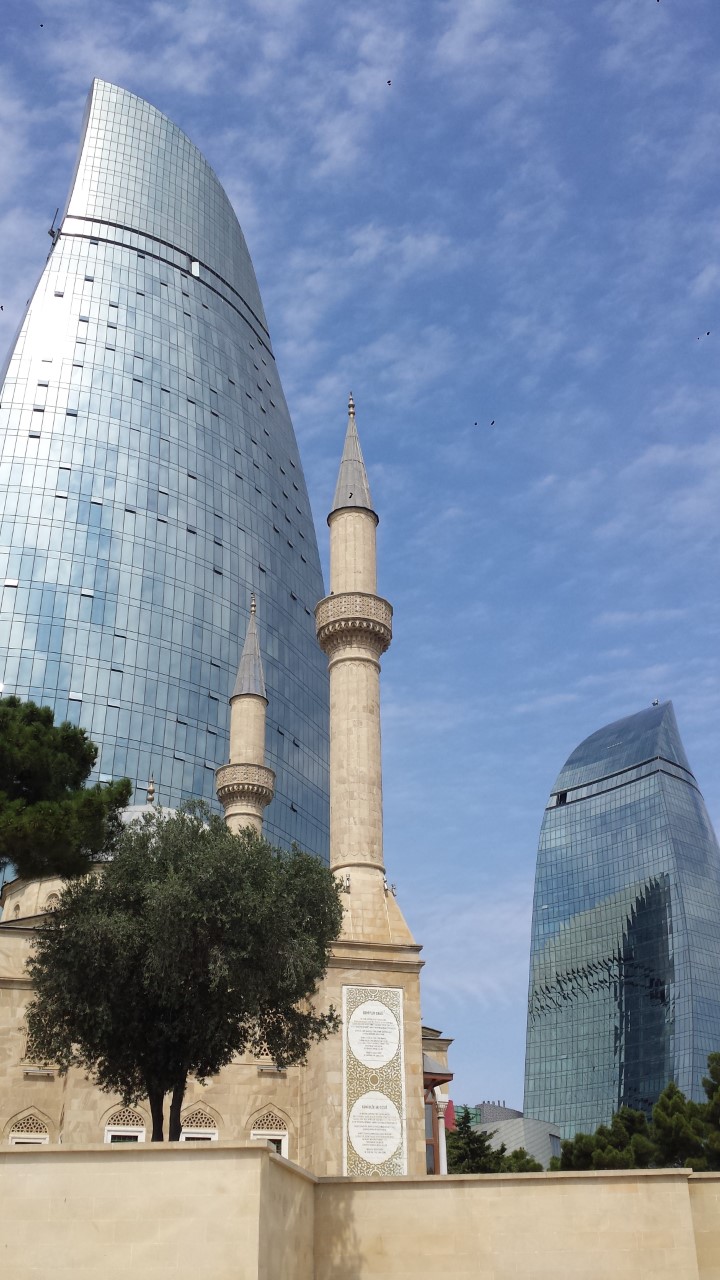 Llegamos de noche, encontramos un lugar para dormir y nos vamos a cenar, y lo hacemos enfrente de las famosaza FLAME TOWERS, de excepcional belleza y que se conocieron a nivel mundial tras los juegos olímpicos europeos celebrados en 2012 en este país.
