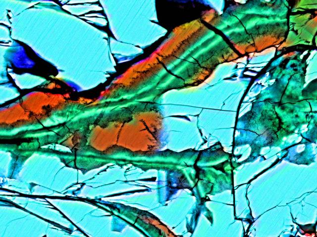 En esta imagen en falso color, se muestran mapas en rayos X superpuestos de silicio (verde), hierro (rojo) y calcio (azul). El carbonato (naranja) se observa sustituyendo al olivino (azul), rodeados ambos por venas de arcilla (verde).
