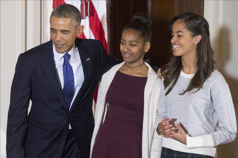 En la ceremonia, a la que acudieron junto a su padre, Malia, de 16 años, llevaba una minifalda de cuadros con un jersey gris, mientras que Sasha, de 13, lucía un vestido corto de color marrón con una chaqueta larga encima.