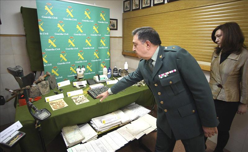 Al cabo de unas horas, estas dos personas abandonaron el yacimiento y regresaron al vehículo, momento en el que se les dio el alto y se les intervino tres detectores de metales y restos de cerámica y otros objetos manchados de barro, con signos de haber sido desenterrados esa misma noche.