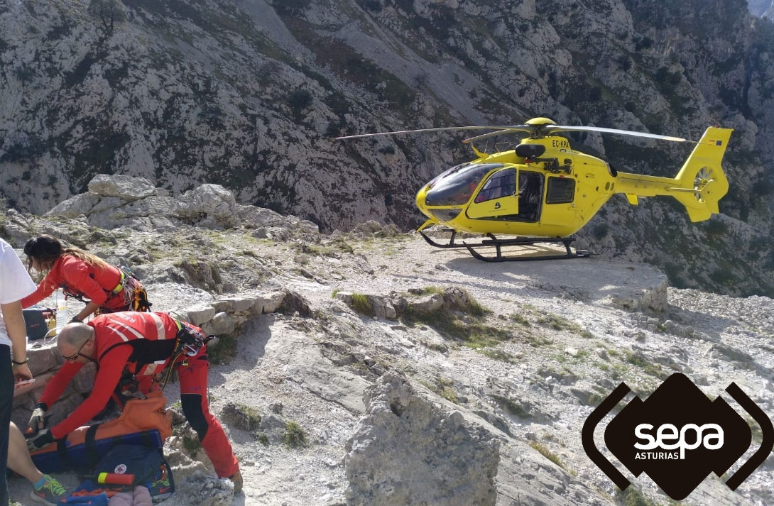 Una mujer ha sido evacuada por el Grupo de Rescate de Bomberos del Servicio de Emergencias del Principado de Asturias (SEPA), a bordo del helicóptero medicalizado, al Hospital de Arriondas. La afectada, que estaba haciendo la Ruta del Cares, en Cabrales, al parecer se sintió indispuesta y sufrió un traspié, presentando una posible fractura de tibia y peroné.