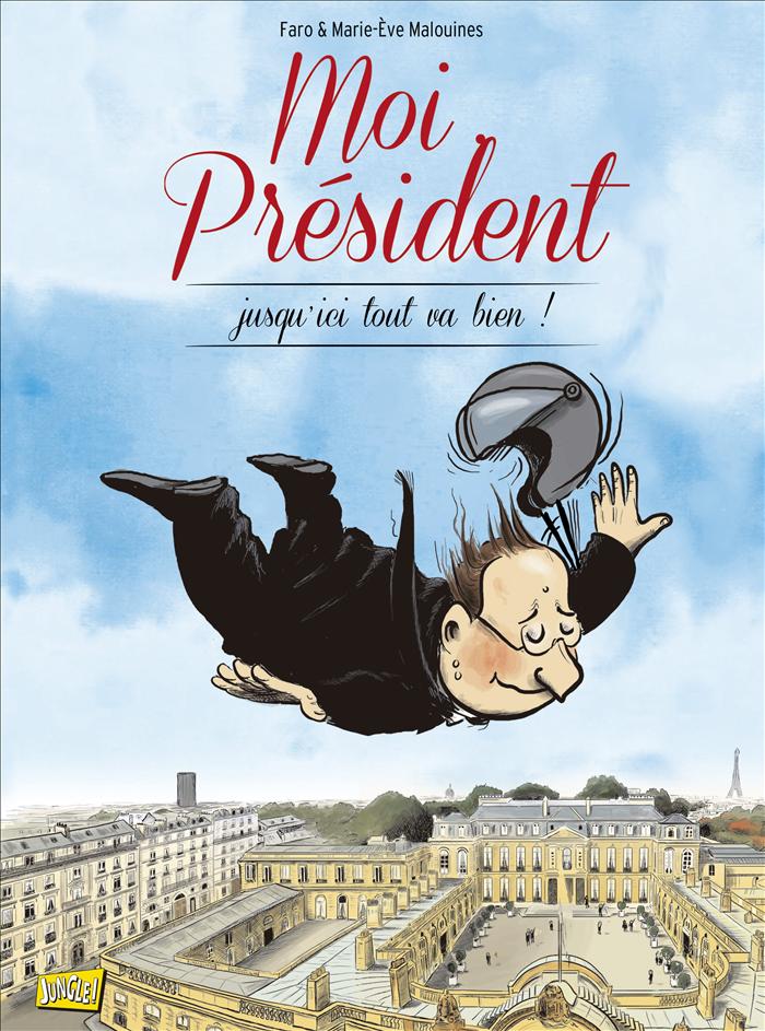 Sobre la flotante figura del político puede leerse el título del cómic: «Yo, presidente. Hasta aquí, todo va bien», en alusión a la anáfora que Hollande utilizó hasta en quince ocasiones durante un debate en la campaña presidencial contra el conservador Nicolas Sarkozy, a quien le arrebató la jefatura del Estado en 2012.