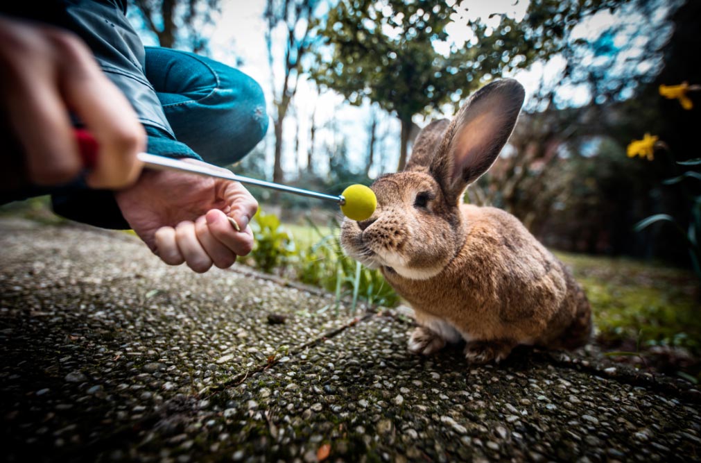 ¿Cómo proceder concretamente? Primero, hay que sostener el palillo en frente del animal para que tenga que estirarse para tocar la pelota. Al tocar, se hace clic y se otorga una recompensa a la mascota. Luego, hay que mantener el palo un poco más lejos, de modo que el conejo o el roedor tengan que dar un paso adelante para tocar el palo.
