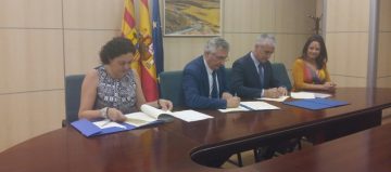 El consejero de Desarrollo Rural del Gobierno de Aragón, Joaquín Olona, y Juan Carlos Sánchez, jefe de la Obra Social de Ibercaja, han rubricado esta mañana este acuerdo. Acompañados por la directora general de Sostenibilidad, Pilar Gómez, y Magdalena Lasala responsable del área Cultural y Educativa de la Obra Social.