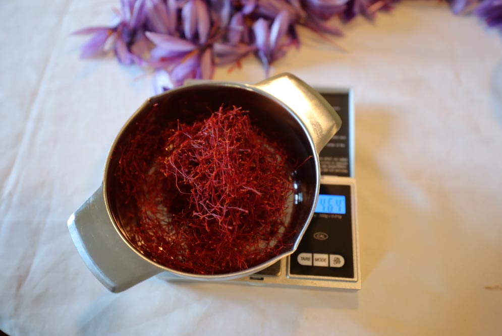 El elevado precio del azafrán, que ronda los 30.000 euros el kilogramo, se debe al complejo proceso de su recolección. Los agricultores pueden utilizar maquinaria para plantar los bulbos pero las flores deben ser recogidas a mano y los estigmas también deben ser retirados uno a uno de forma manual.