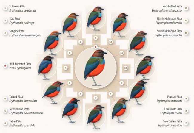 Así, Erythropitta caeruleitorques (de las islas Sangihe en Indonesia) y Erythropitta palliceps (de las islas indonesas de Siau, Tagulandang y Ruang) empiezan a considerarse como ‘en peligro’; y E. inspeculata (islas Talaud en Indonesia) y E. splendida (en las islas Tabar en Papúa Nueva Guinea) como ‘vulnerable’.