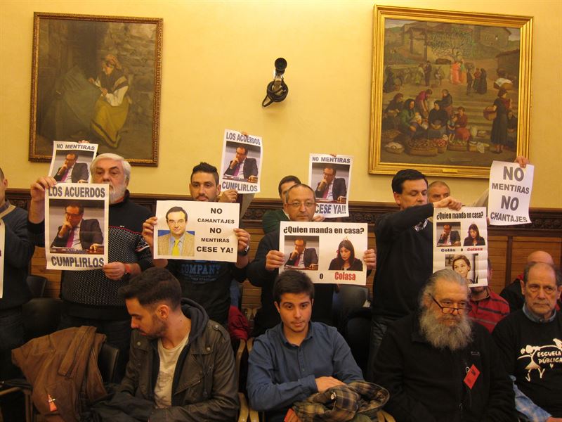 Este punto ha tenido su contestación en el Pleno, donde representantes sindicales han mostrado carteles al inicio del mismo en protesta por el «incumplimiento» del Gobierno local de hacer efectivo el pago este mes de marzo. En los carteles, con fotos de la alcaldesa, Carmen Moriyón, la edil de Hacienda, Ana Braña, y el director general de Servicios, Vicente Hoyos, se podían leer mensajes como: ‘No chantajes. No mentiras. Cese ya’, referido a este último, o ‘¿Quién manda en casa? Colás o Colasa’.