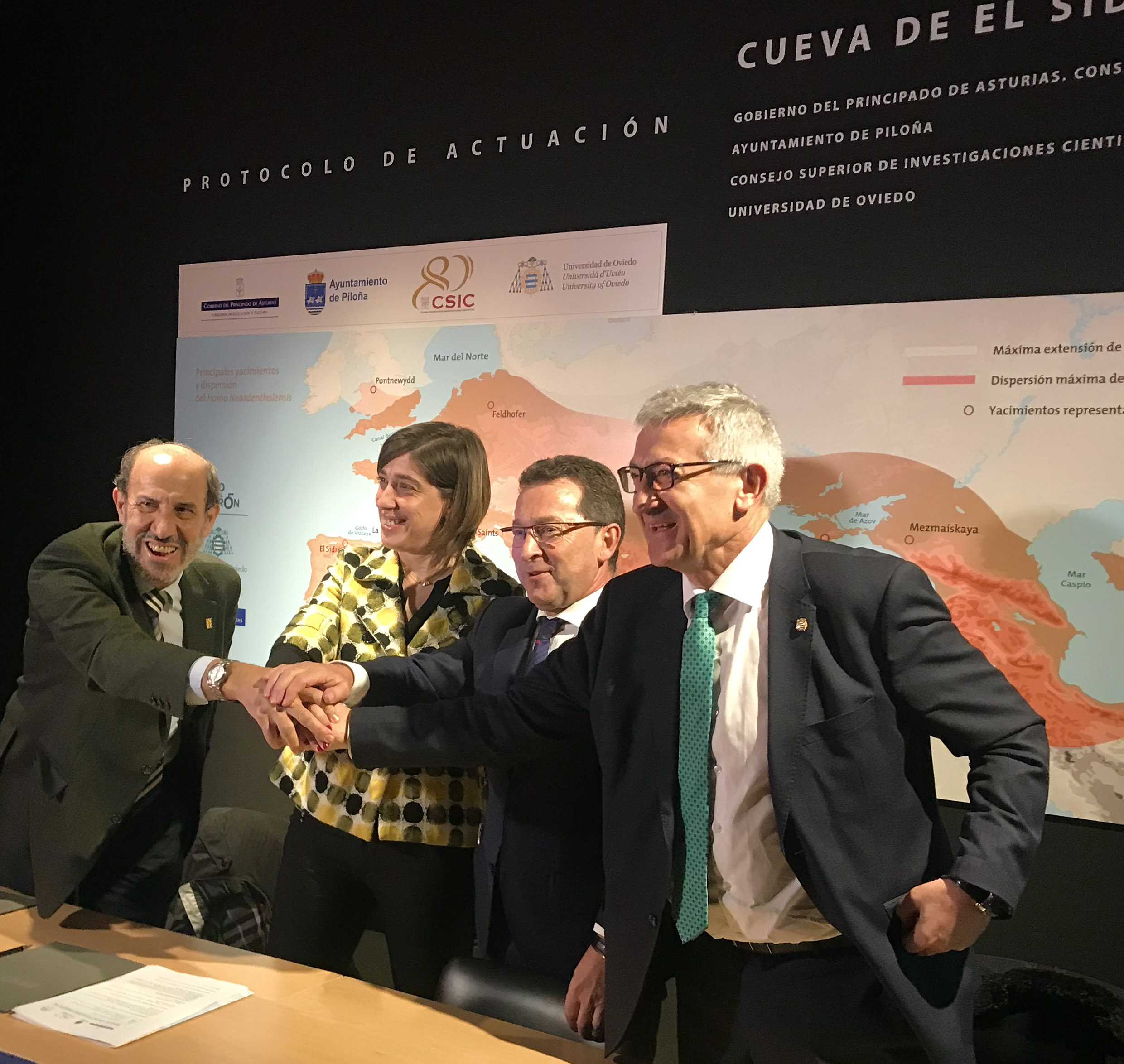 “El Gobierno de Asturias, el Ayuntamiento de Piloña, el Consejo Superior de Investigaciones Científicas (CSIC) y la Universidad de Oviedo han suscrito hoy el protocolo general de actuación para la protección, conservación, investigación y difusión de la cueva de El Sidrón, aprobado por el Consejo de Gobierno el 20 de febrero.