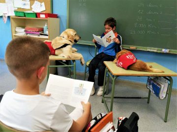 Los perros de educación asistida, con la ayuda de técnicos especializados y coordinados con los profesores/educadores, constituyen un potente motor exterior que contribuye a la formación de los niños en varias facetas: incrementa la motivación, identifica problemas de socialización, fomenta los hábitos de lectura, disminuye la ansiedad, estimula su atención y concentración, y aumenta su autoestima y confianza. A nivel específico, estos perros pueden trabajar en los aspectos formativos más interesantes para cada escuela: reforzar los programas de lectura y escritura, así como tratar determinados trastornos que dificultan el aprendizaje de algunos alumnos.