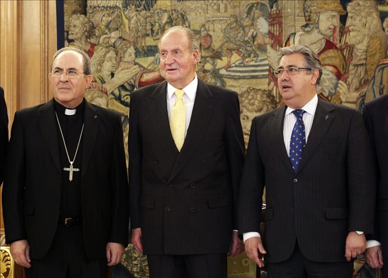 El arzobispo de Sevilla, Juan José Asenjo, y el alcalde de la capital andaluza, José ignacio Zoido, encabezaban la delegación de trece representantes de la Fundación que ha acudido al Salón de Audiencias de la Zarzuela, donde el Monarca les ha saludado muy cordialmente y ha posado junto a todos para los medios gráficos antes de reunirse con ellos a puerta cerrada.