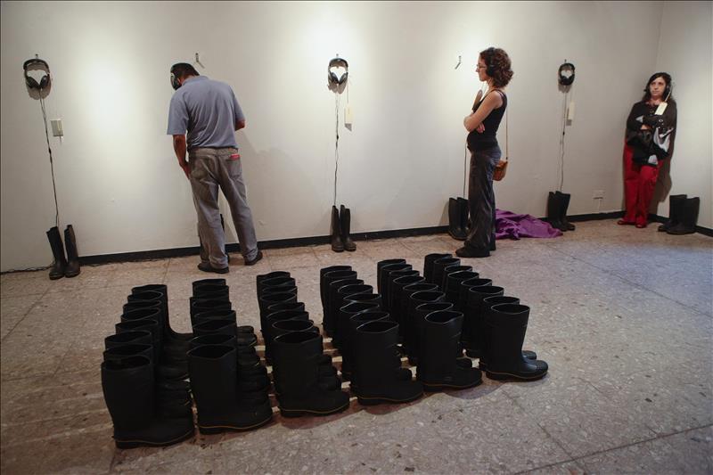 La muestra sonora se complementa con decenas de botas de hule, cuyo uso es común en el campo colombiano y que también son el calzado característico de los guerrilleros colombianos, relató la periodista.