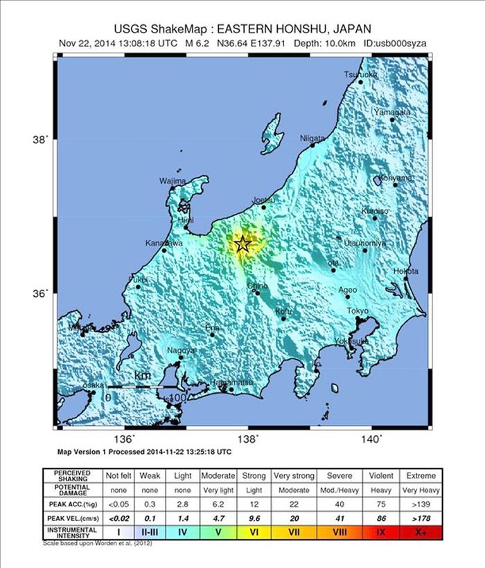 El terremoto alcanzó una intensidad de 6 inferior en la escala japonesa cerrada de 7 grados (centrada en las zonas afectadas más que en la intensidad del temblor) en la ciudad de Nagano y en las localidades de Otari y Ogawa, mientras que Hakuba registró una intensidad de 5 superior.