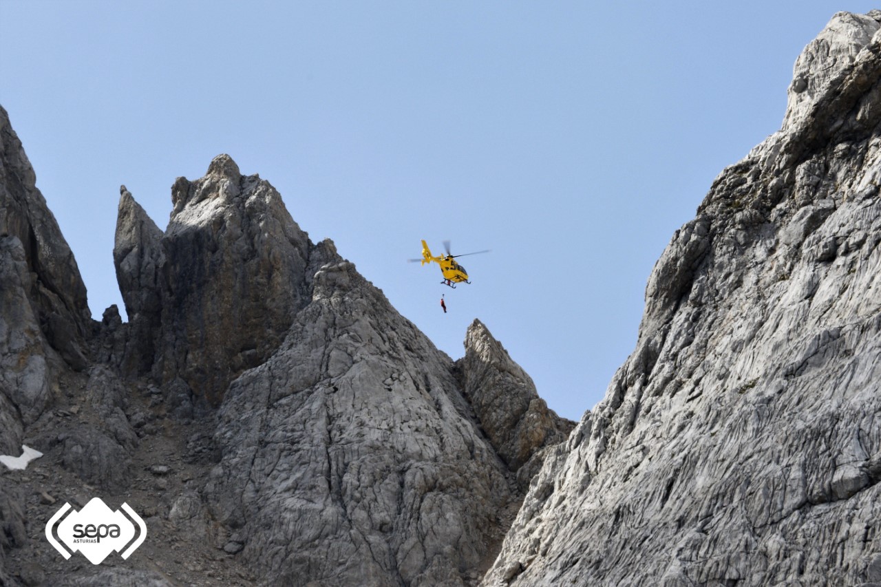 El Grupo de Rescate de Bomberos del Servicio de Emergencias del Principado de Asturias (SEPA), a bordo del helicóptero medicalizado del organismo autónomo, ha rescatado a un senderista que sufrió una caída, de unos 60 metros, cuando descendía de la Torre de San María de Enol, por la Grieta Rubia, una zona con mucho desnivel, en Cangas de Onís.