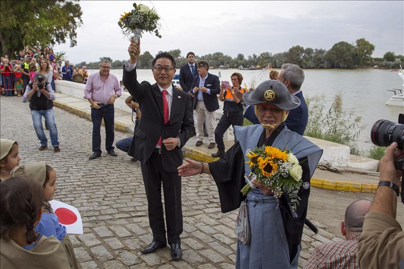 El embajador japonés, empresarios y autoridades de la localidad nipona de Sendai, de donde partió la Embajada Keicho, han recreado la última singladura de este samurai y han navegado desde Sanlúcar de Barrameda (Cádiz) hasta Coria del Río a bordo del yate de época Falcao, que ha atracado en el paseo fluvial de esta localidad sobre las 17:00 horas.