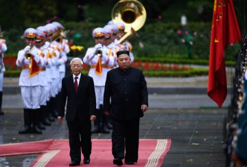 Kim ha llegado al palacio presidencial a las 15.30 horas y ha abrazado a su llegada al presidente vietnamita, que es también el líder del Partido Comunista, que gobierna en Vietnam en un régimen de partido único. Las bandas de música han interpretado el himno nacional norcoreano tras la llegada de Kim y un grupo de niños ha ondeado banderas de los dos países.