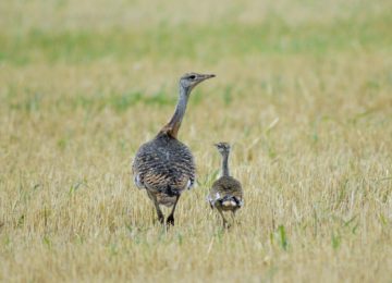 Los pollos de avutarda tienen un periodo de dependencia materna de entre 6 y 18 meses. Aunque durante este periodo buscan ellos mismos su comida, reciben alimento adicional de la madre.