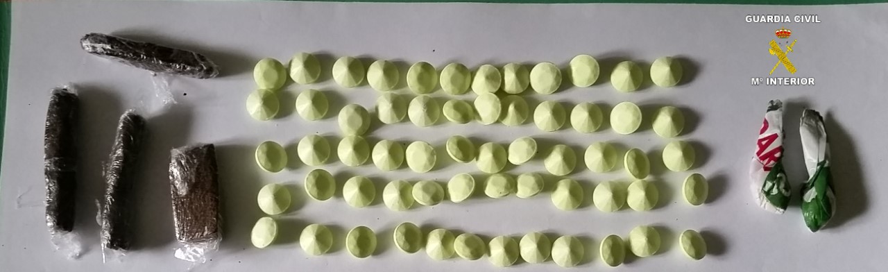 En el cacheo posterior al que fue sometido esta persona, se le encontró otra caja de cartón con 60 pastillas de MDMA, del color verde, denominadas “diamantes”, 4 envoltorios de plástico con hachís en su interior, que arrojaba un peso de 8,7 gr., y dos envoltorios con 1,2 gr. de cocaína. Además de una serie de plásticos cortados de forma circular para la distribución de la droga.