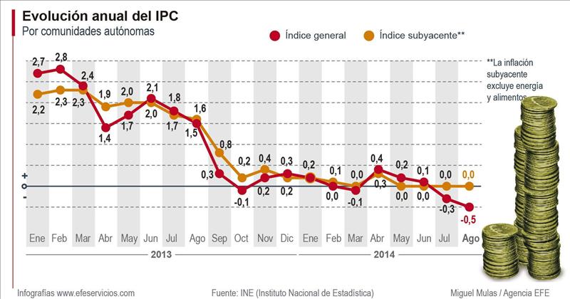 El Instituto Nacional de Estadística (INE) ha confirmado hoy el dato que adelantó hace dos semanas, que acentúa la caída ya registrada en julio (-0,3 %) y que aumenta el debate sobre la posibilidad de que se produzca deflación (caída continuada de los precios).