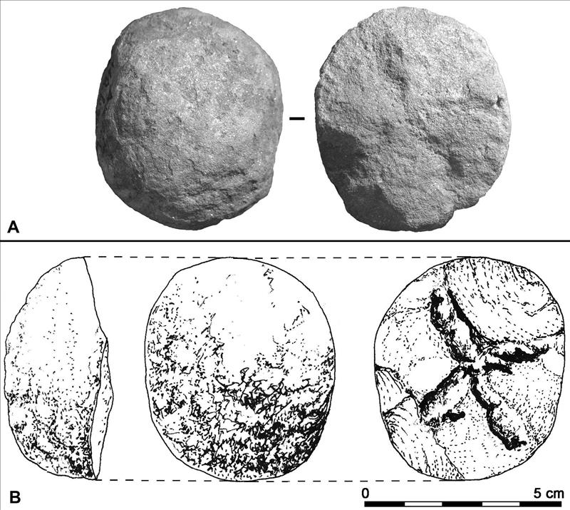 La piedra, de factura neandertal y de forma esférica en sus orígenes, fue hallada en un nivel de hace al menos 48.000 años. Su autor le dio un golpe para crear una superficie plana y grabar en ella, a base de pequeños golpes, dos líneas que se cruzan.